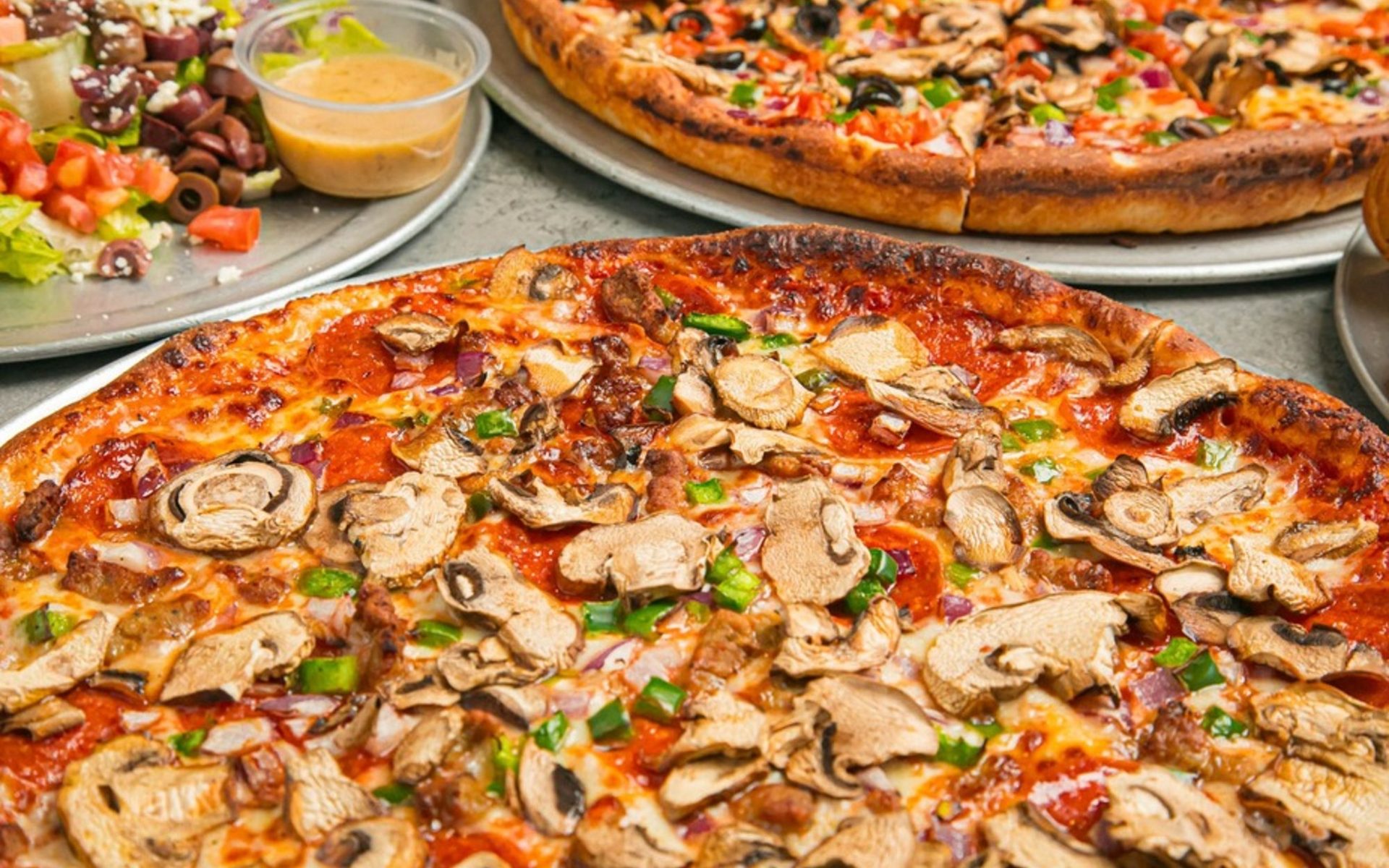 Indulge in our fresh Greek salad, bursting with crisp lettuce, juicy tomatoes, tangy feta cheese, and briny Kalamata olives. Tossed in a zesty Greek dressing, it's a delightful medley of flavors that pairs perfectly with our authentic pizzas and vegetarian options. Savor the taste of Greece in every bite.